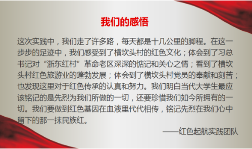 信息学院红色起航实践团队作为第十一支队伍上台展示。为了进一步学习红色文化,传承红色精神。红色起航团队以“重走抗战路,为颂革命红”为主题,来到了被誉为“浙东红村”的浙江省余姚市梁弄镇横坎头村。我们参观了浙东抗日旧址群、正蒙学堂、革命烈士纪念碑、四明山革命事迹陈列馆等红色旧址;采访老党员,接受爱国主义教育;调研革命老区乡村振兴模式和青少年红色基因传承;同时,团队利用所学知识为余姚市中小学实践基地拍摄了一支宣传片。团队活动也得到了团省委、当代大学生网、大学生之家、中国大学生网、浙江省学联、和山青年等微博,网站,公众号的关注和报道。