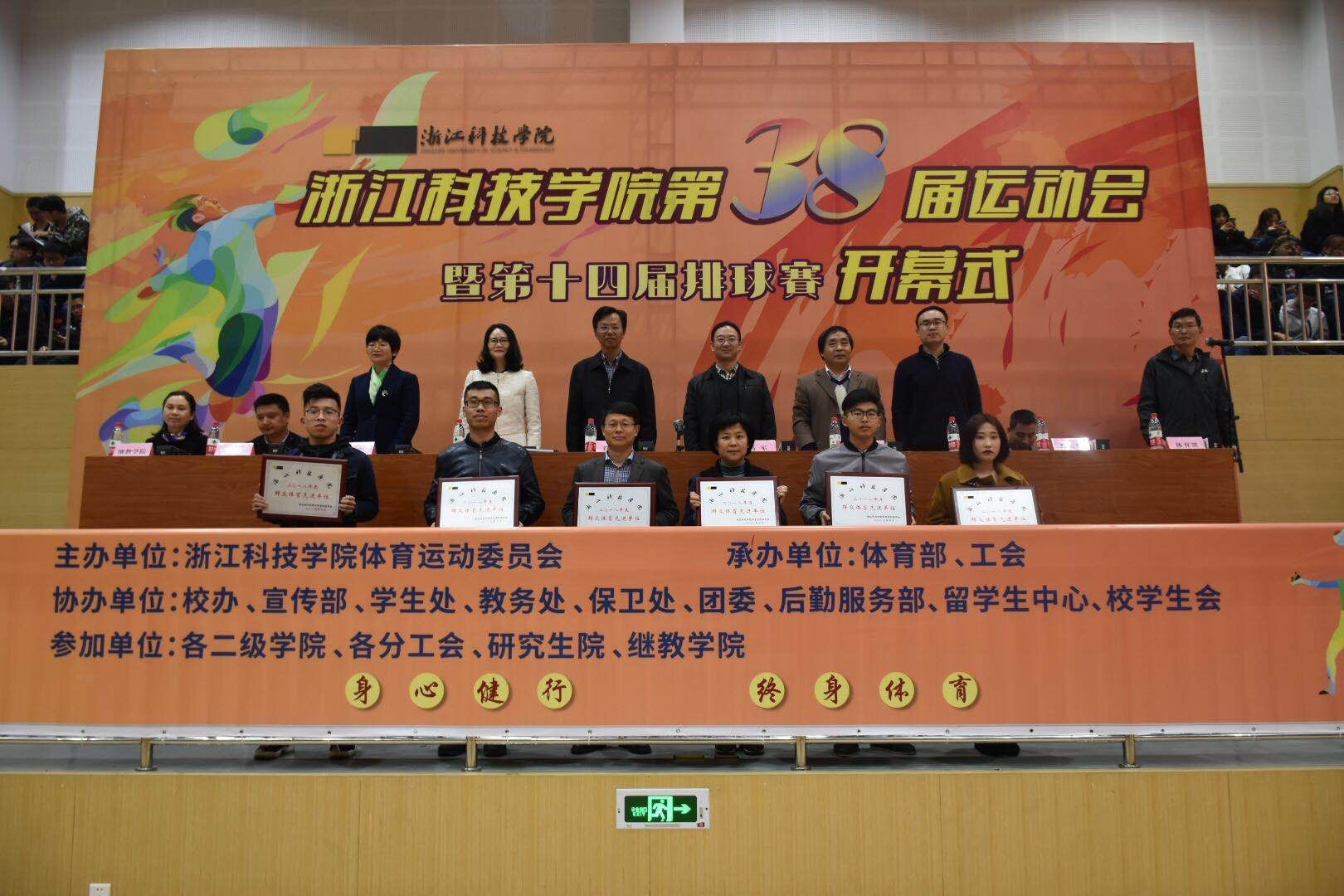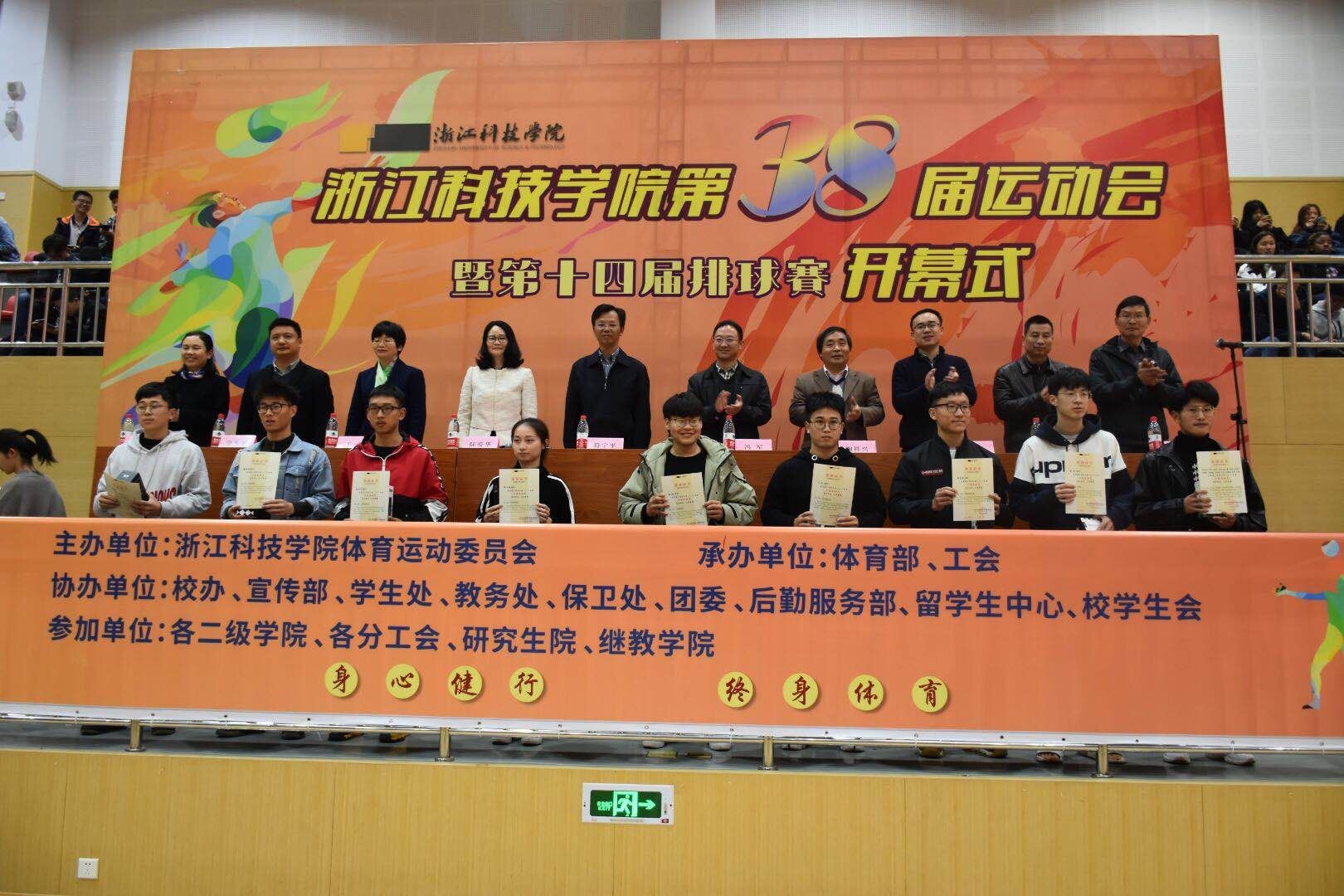 4月11日下午,校第三十八届运动会开幕式小和山校区体育馆举行。校党委副书记符宁平、副校长冯军、纪委书记陆爱华等出席开幕式并为受表彰的2018年度校“群众体育先进单位”和“学生十佳运动员”代表颁奖。信息学院获得群众体育先进单位荣誉称号,通信162秦环宇获得十佳运动员荣誉称号。信息学院党委副书记姜国泉老师作为群众体育先进单位代表在大会发言,姜国泉老师总结了过去的一年中信息学院取得的各项优异成绩,勉励同学们再接再厉,坚持锻炼,提出了每天锻炼一小时的倡议!开幕式结束后,第十四届校排球赛开战。